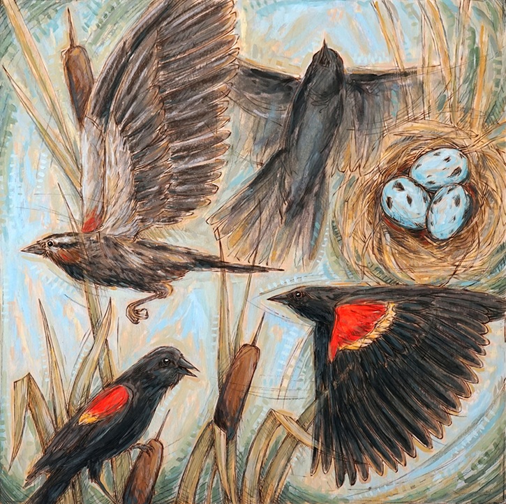 “A Red-winged Blackbird Family” Wood burning and mixed media 20″ x 20″ $500
