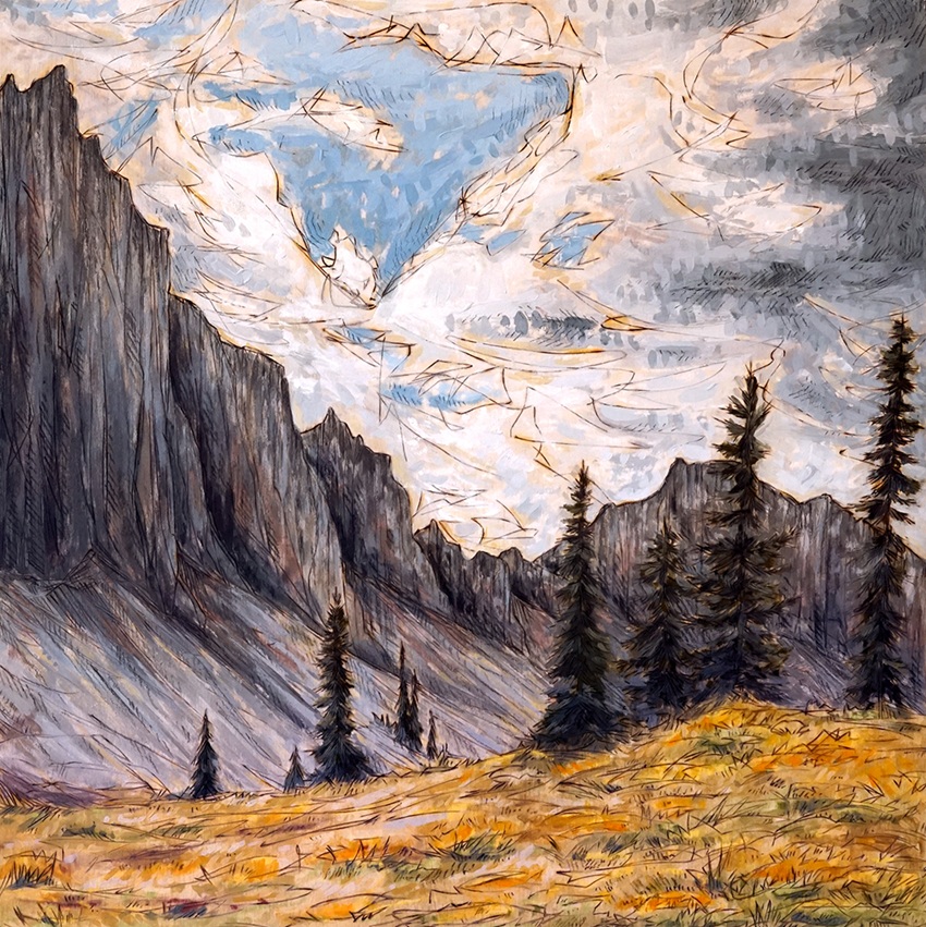 “Maple Pass” Wood Burning & Mixed Media 18″ x 24″ $500